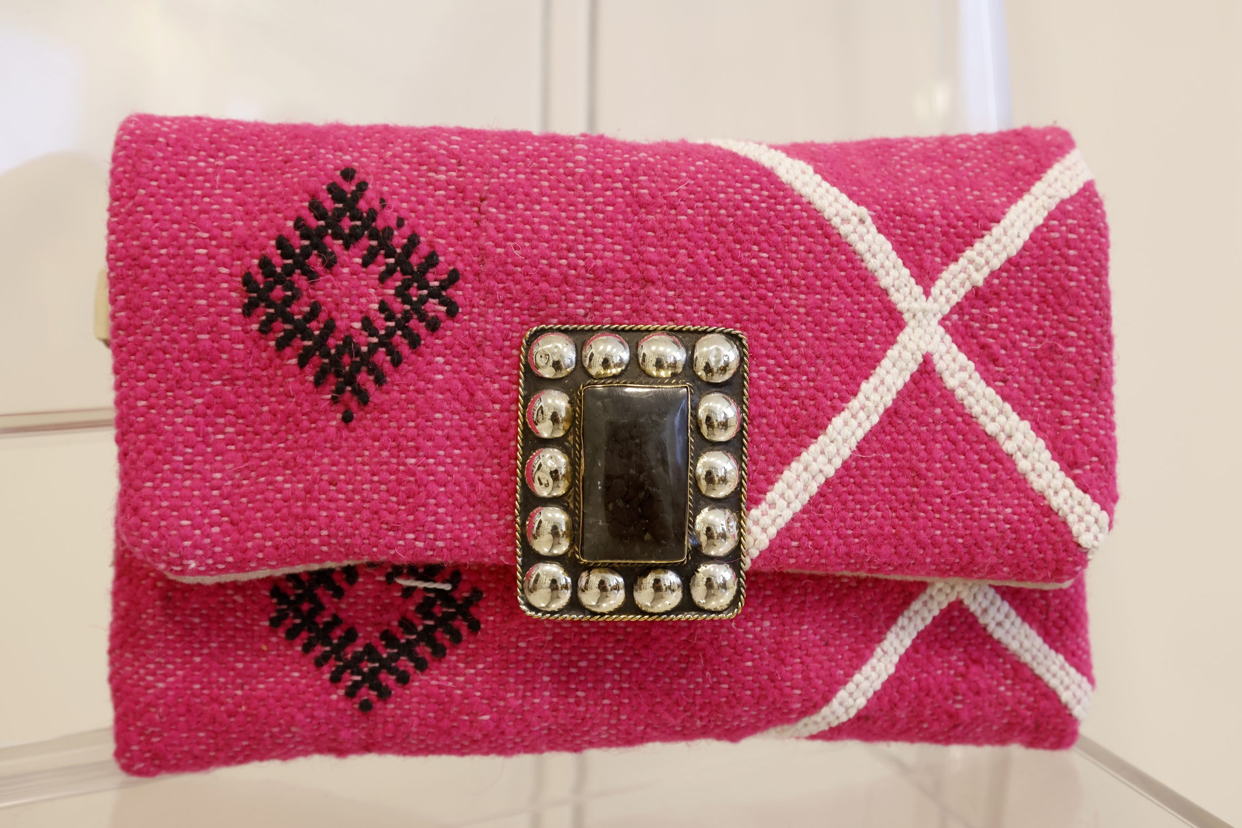 Este bolso hecho a mano en Marruecos es una verdadera obra de arte, con trozos de alfombra Bereber en un vibrante color rosa. El cierre joya étnica plateada y negra le brinda un toque elegante y único. Además, cuenta con una cadena extraíble que te permite llevarlo de diferentes formas, ya sea como un bolso de mano o colgado del hombro. Perfecto para agregar un toque de estilo y originalidad a cualquier outfit.