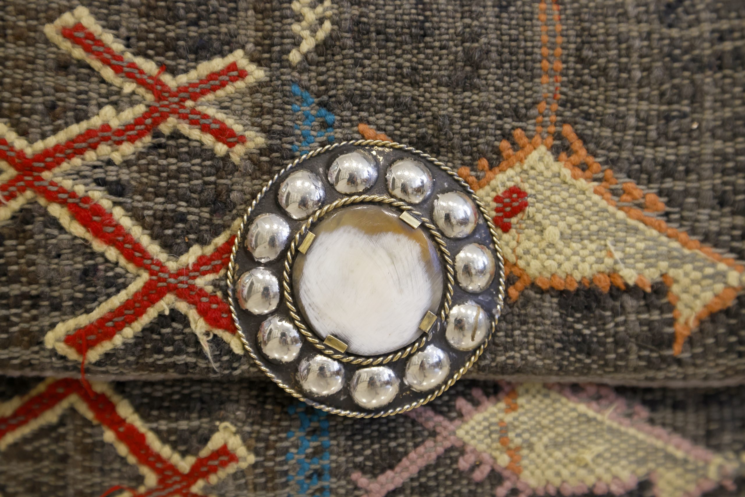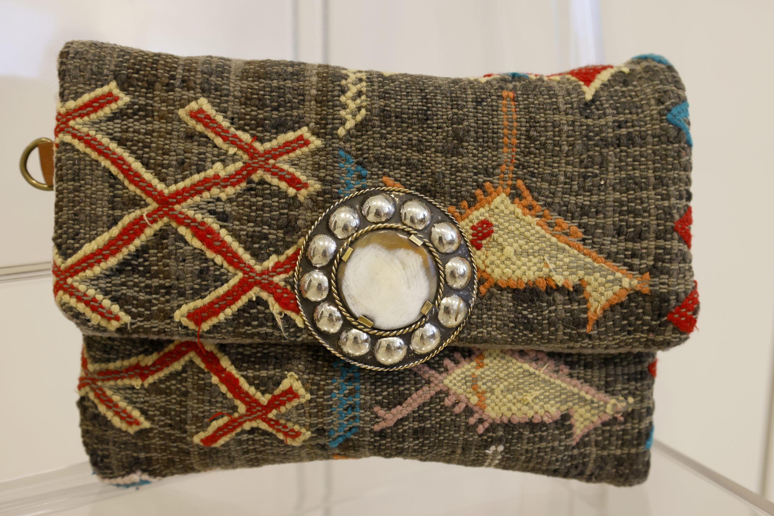 Este bolso hecho a mano en Marruecos es una verdadera obra de arte, con trozos de alfombra Bereber. El cierre joya étnica plateada y blanca le brinda un toque elegante y único. Además, cuenta con una cadena extraíble que te permite llevarlo de diferentes formas, ya sea como un bolso de mano o colgado del hombro.