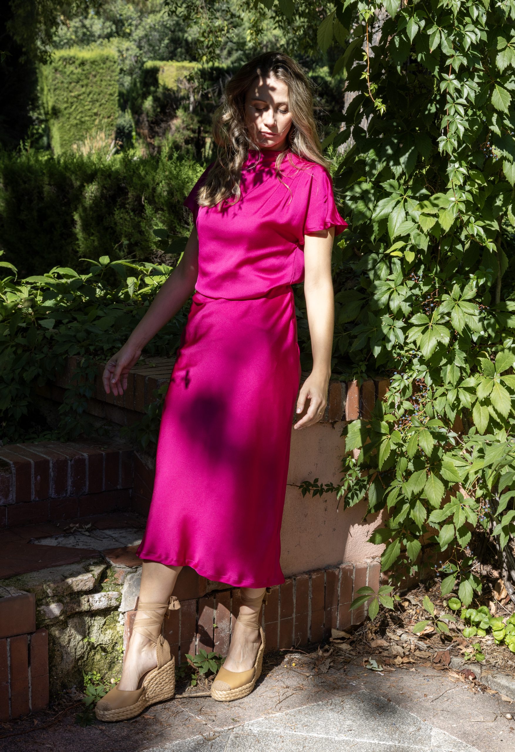 Conjunto de top más falda midi. Confeccionada en seda con forro, esta falda cuenta con una cremallera lateral y un cierre trasero superior con botón para el top que asegura un ajuste perfecto. Hecho a mano en España, en compañía de pequeños comerciantes locales.
