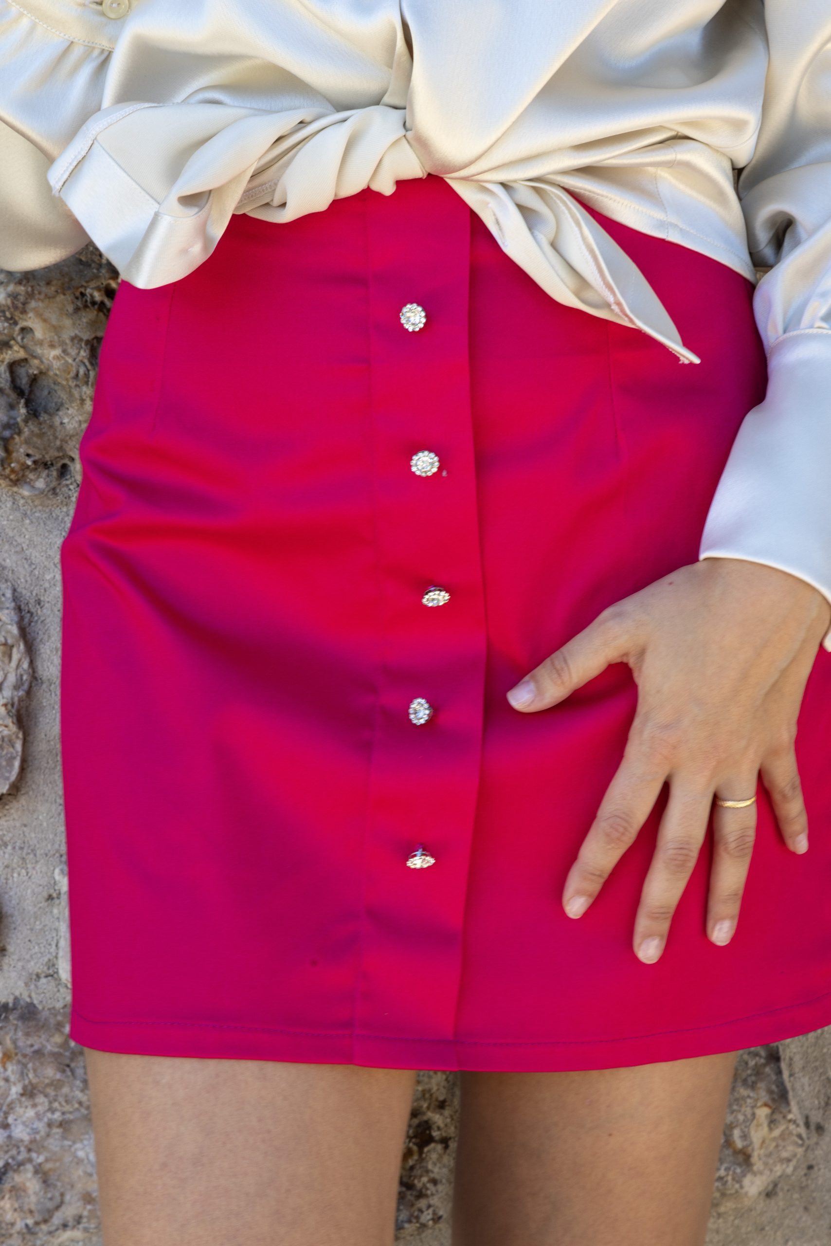 Mini falda confeccionada en algodón. Presenta detalles de botones en la parte delantera que le dan un toque de sofisticación. Además, cuenta con un práctico cierre de cremallera lateral que facilita su colocación. Confeccionadas y cortadas, una a una de forma artesanal, en España.
